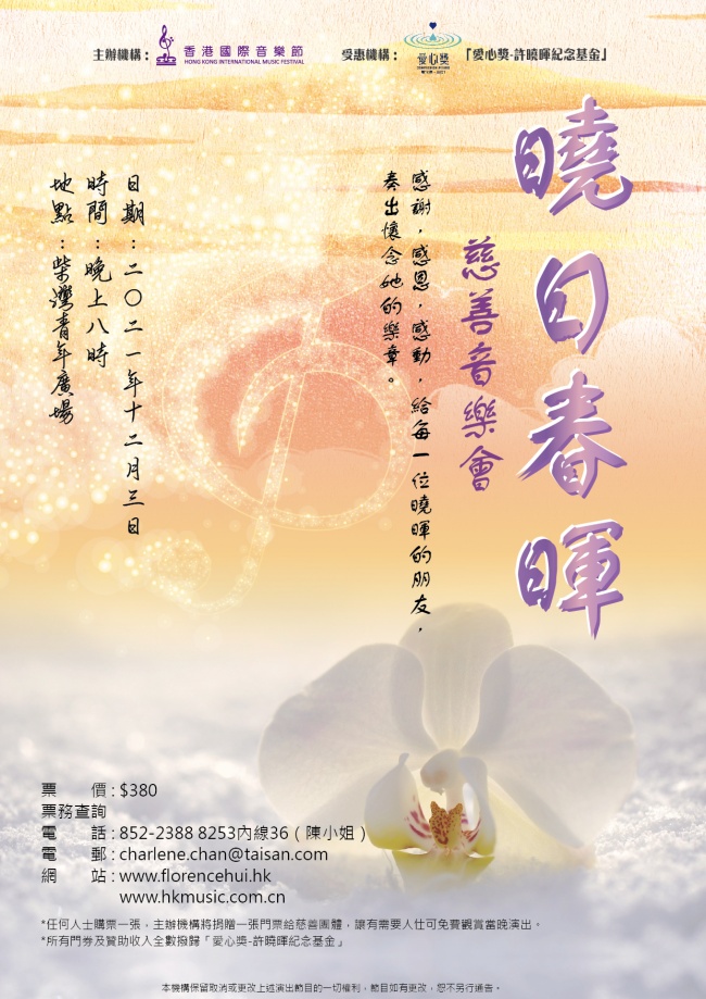 曉日春暉慈善音樂會 感謝,感恩,感動,給每一位曉暉的朋友, 奏出懷念她的樂章。*任何人士購票一張,主辦機構將捐贈一張門票給慈善團體,讓有需要人仕可免費觀賞當晚演出。 *所有門券及贊助收入全數撥歸「愛心獎-許曉暉紀念基金」 日期 2021年12月3日 時間 晚上8時 地點 柴灣青年廣場 票價 HKD380 2388 8253 內線36(陳小姐) 電郵 charlene.chan@taisan.com 相關網站 www.florencehui.hk 直接報名 關於我們 │ 聯絡我們 │ 私隠政策聲明 │ 網站導航 │ 香港音樂教育學院 │ 相關連結 關注HKIMF : HKIMF │ : HK_IMF │ 香港賽事統籌咨詢處 : 852 – 2117 1726 │ 客户服务微信号 : : 13332695698 © Hong Kong International…