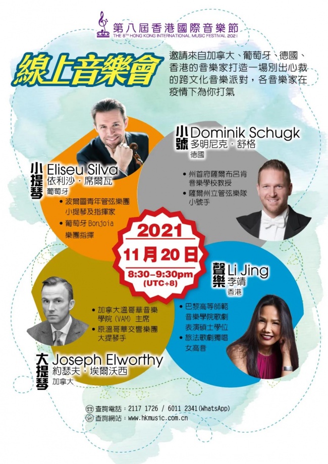 第八屆香港國際音樂節-線上音樂會 第八届香港国际音乐节2021全球总决赛已完满结束,感谢大家对香港国际音乐节的支持,总决赛成绩已在网页公布。 所有奖金及奖项本会已在加快处理,所有的奖项匀在香港总部发到世界各地的分部或承办点, 但因现时各地疫情令运输也受到不同程度的影响,也请各参赛者及家长理解。 线上音乐会《香港国际音乐节组委会》特意邀请了4位音乐家于11月20日(本星期六)晚上8:30进行免费线上音乐会,我们希望透过音乐传播正能量,鼓励及支持同住地球村的所有人,大家一起互勉,一起努力对抗疫情,为不幸的感染者打气加油,祝愿大家远离疾苦。 Youtube直播连结: https://www.youtube.com/watch?v=zAJmGOFnCHU Bilibili直播连结: https://www.bilibili.com/video/BV1K44y1v7kb/ 關於我們 │ 聯絡我們 │ 私隠政策聲明 │ 網站導航 │ 香港音樂教育學院 │ 相關連結 關注HKIMF : HKIMF │ : HK_IMF │ 香港賽事統籌咨詢處 : 852 – 2117 1726 │ 客户服务微信号 : : 13332695698 © Hong Kong International Music Festival All rights reserved