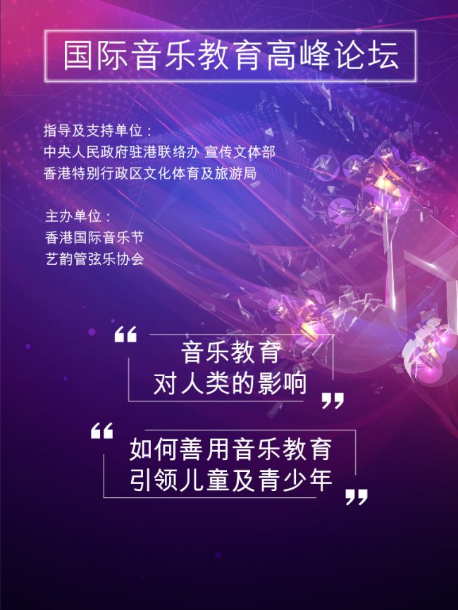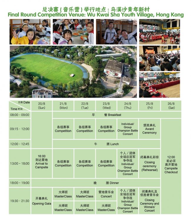 指導及支持單位 中央人民政府駐港聯絡辦 宣傳文體部 香港特別行政區政府文化體育及旅游局 主辦單位 香港國際音樂節 藝韻管弦樂協會 國際音樂教育高峰論壇日程 住營地日程:8月20-26日住酒店日程:8月20-26日音樂節日程:8月20日-26日 8月20日 13:30-17:15 大會安排人員在香港國際機場接機,送往入住酒店 19:00 前往沙田鄉議局大樓集合(酒店旁邊步行2分鐘,請務必准時提早到達) 19:30-22:00 觀賞音樂節開幕禮大師音樂會(遲到者典禮及演奏期間不能進場) 8月21日 07:30-08:50 酒店自助早餐 08:50 專車接送前往烏溪沙營地(第一班車,請先讓早上11:00前參賽人士乘座,專車只提供給預訂人士乘座,其他人士請自行乘搭交通工具前往) 10:00 專車接送前往烏溪沙營地(第二班車,本班車將准時開出,之後到營地的參賽選手需自行乘搭交通工具前往) 09:30-18:30 營地各組賽事 12:00-13:30 午餐(可在營地「波仔」購買盒飯,數量有限售完即止) 18:00-19:00 晚餐(可在營地「波仔」購買盒飯,數量有限售完即止) 19:30-21:30 音樂大師班欣賞 8月22日 07:30-08:50 酒店自助早餐 08:40 專車接送前往烏溪沙營地(第一班車,請先讓早上 11:00 前參賽人士乘座,專車只提供給預訂人士乘座,其他人士請自行乘搭交通工具前往) 10:00 專車接送前往烏溪沙營地(第二班車,本班車將准時開出,之後到營地的參賽選手需自行乘搭交通工具前往) 09:15-18:30 營地各組賽事 12:00-13:30 午餐(在營地「波仔」購買盒飯,數量有限售完即止) 18:45 專車接送前往歡迎晚宴(只限地區承辦領隊上限兩人及已經預訂人士) 19:30 歡迎晚宴(須預訂每位收 500 元),住酒店人士步行約 5 分鐘(與世界各地數十位教授共進晚餐)彩福皇宴地址:沙田石門安群街 3 號經瑞廣場一期 3…